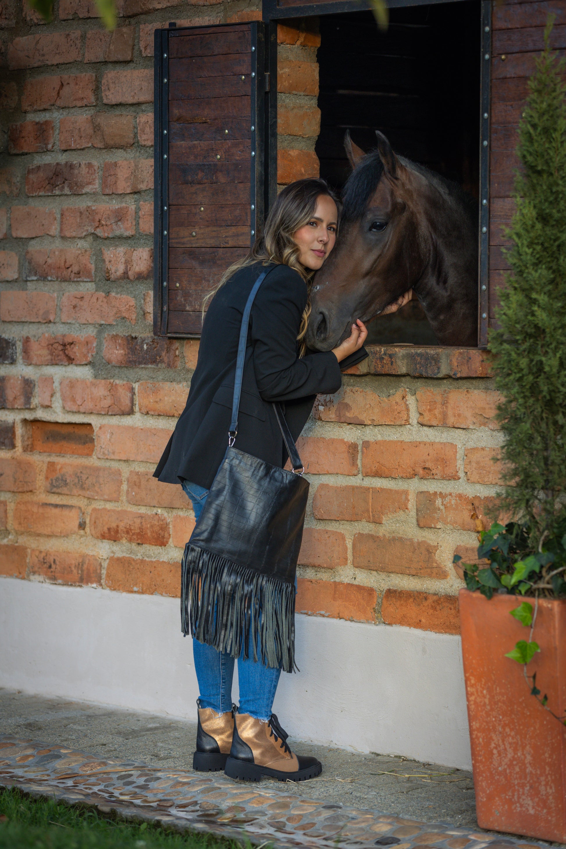 Bolso fabricado en cuero napa confección con flecos, correa graduable y bolsillo interno
