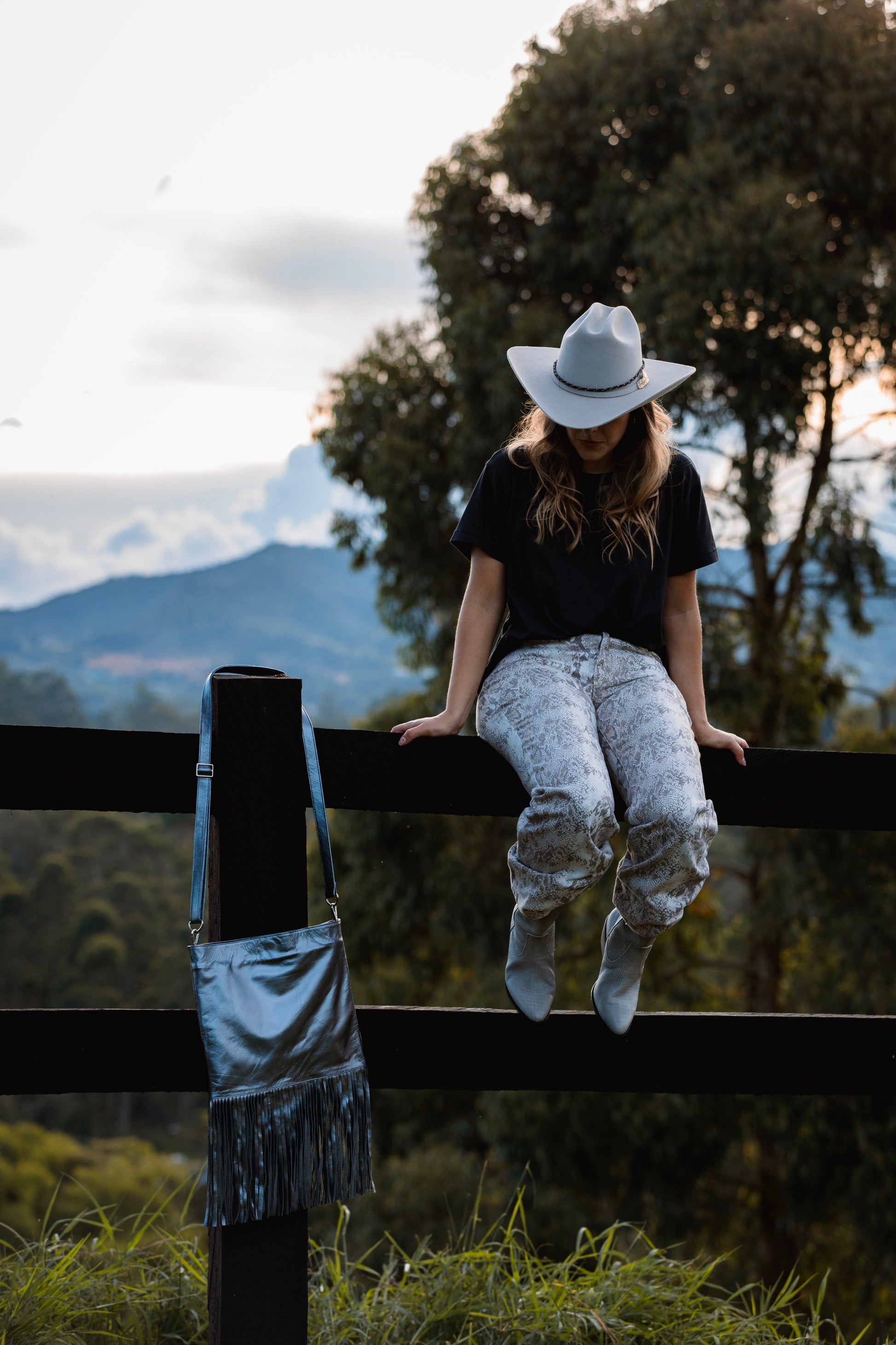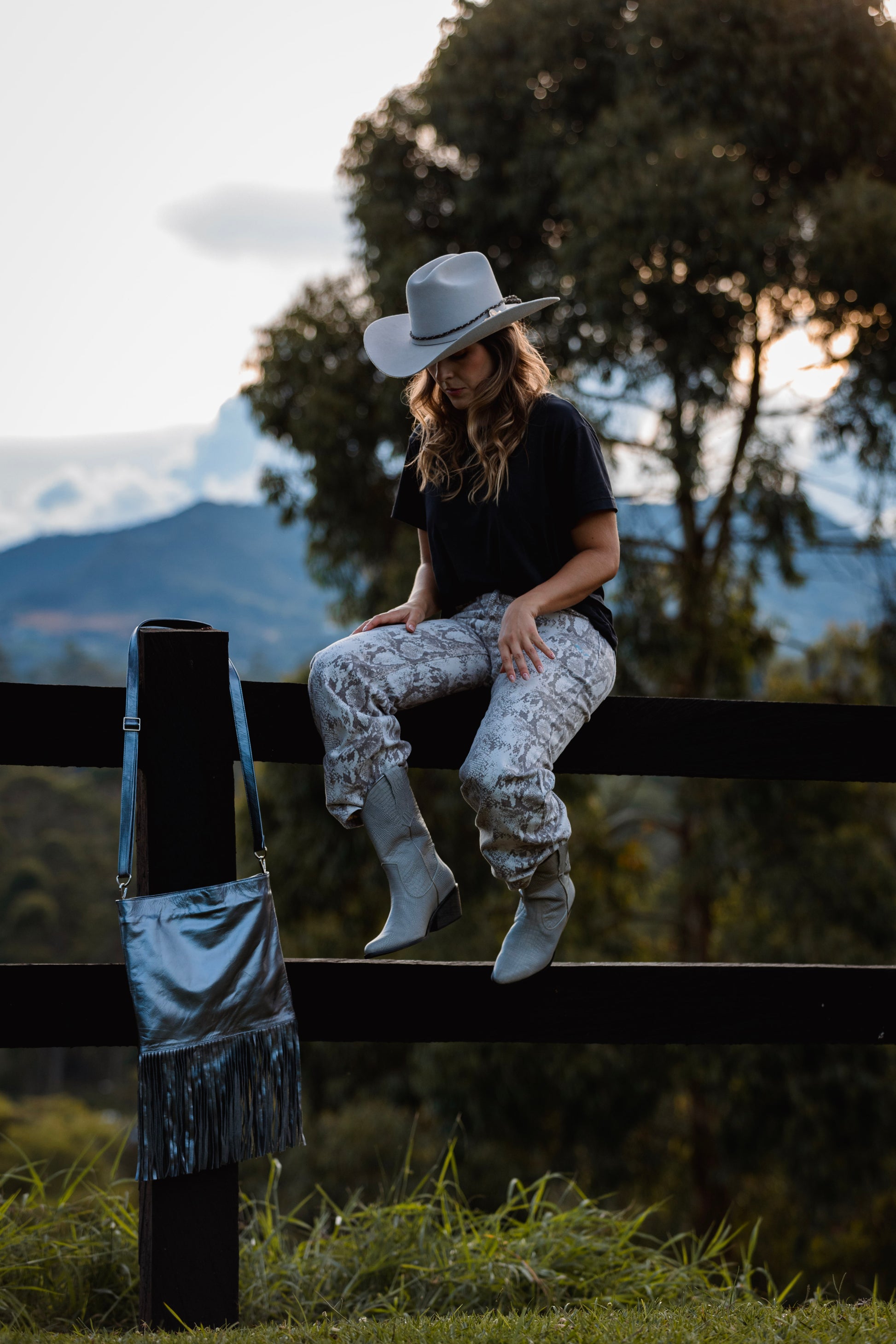 Bolso fabricado en cuero napa confección con flecos, correa graduable y bolsillo interno