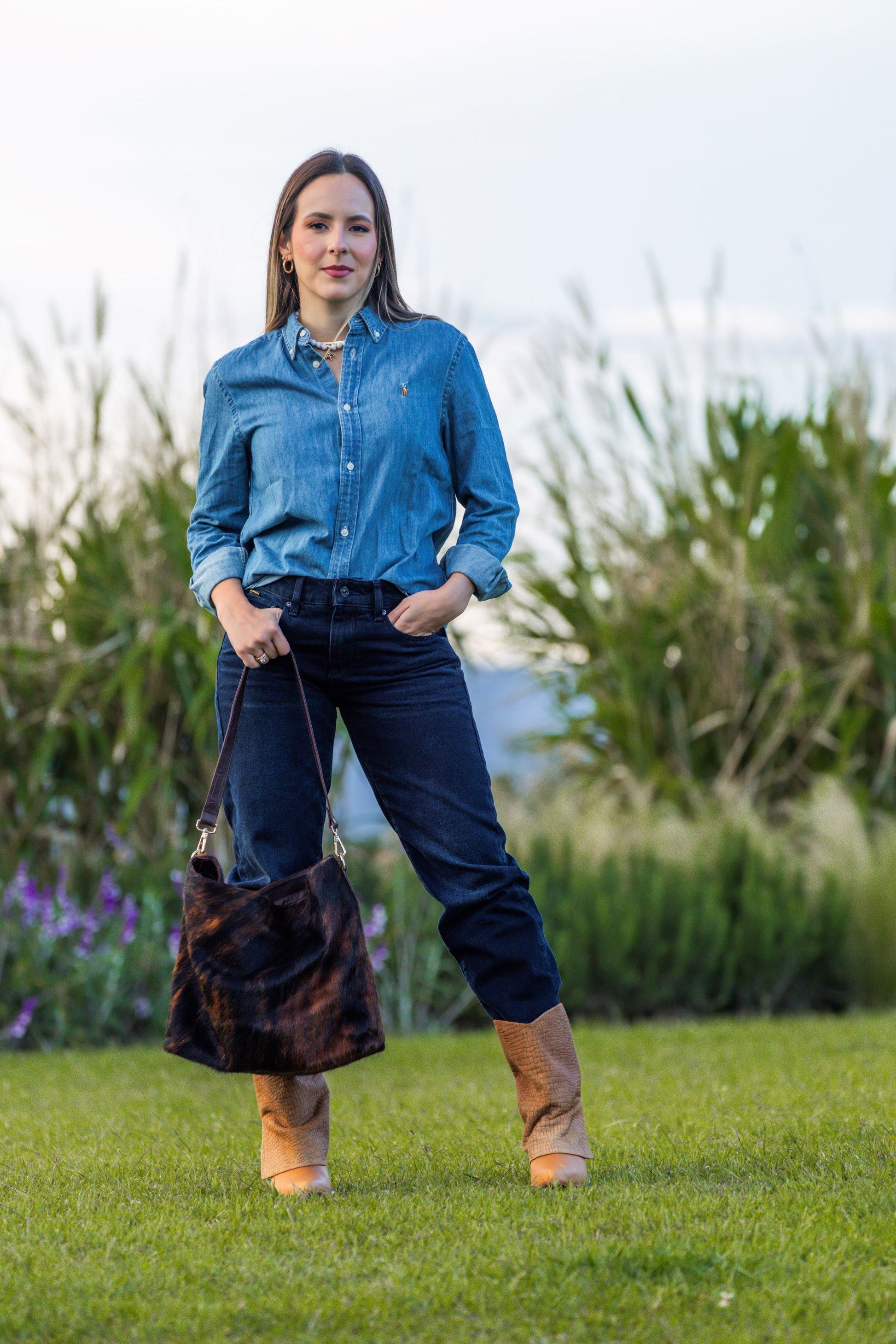 Bolso fabricado en cuero pelo con cargadera en cuero color café y herrajes oro rosa